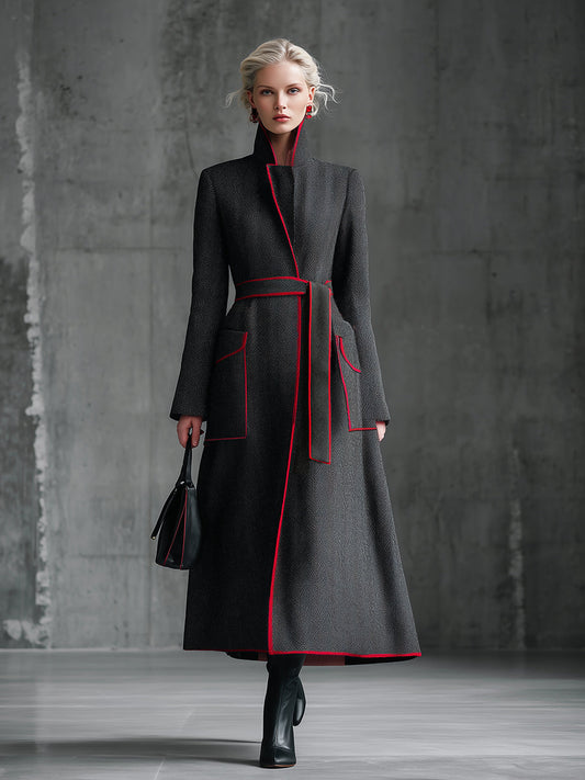 Veste en Laine Grise Sergé avec Col Montant et Détails Rouges - Élégance Haute Couture