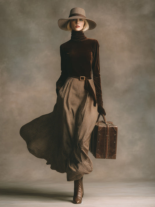 Robe Maxi en Velours Brun à Motif Carreaux avec Col en Pile Chic