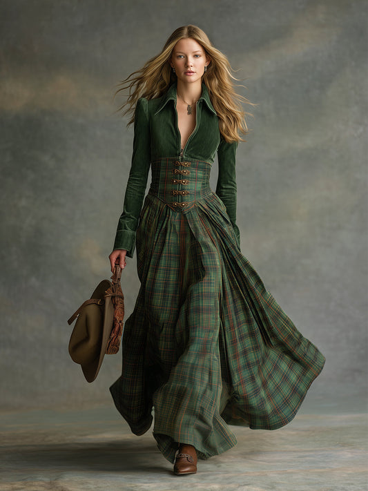 Robe Maxi en Suédine Verte Ethnique avec Col Plaid - Style Rétro