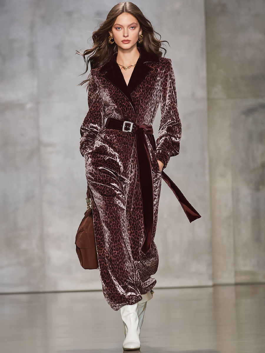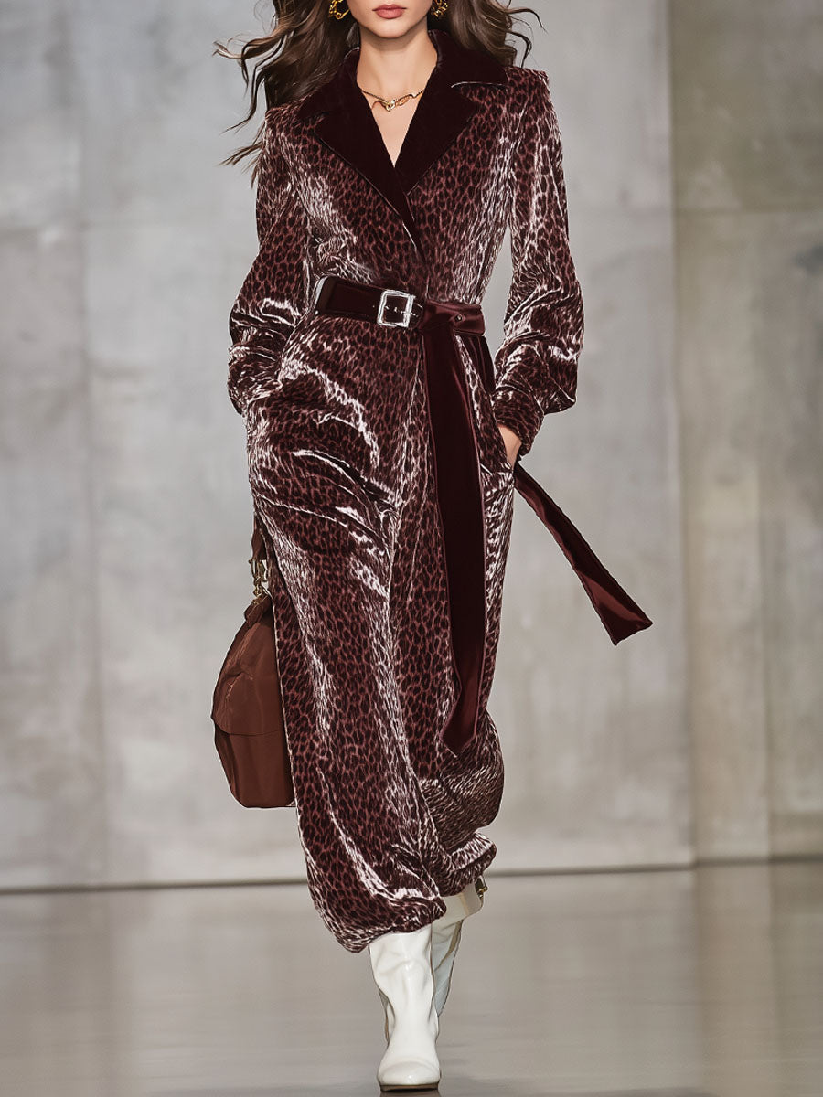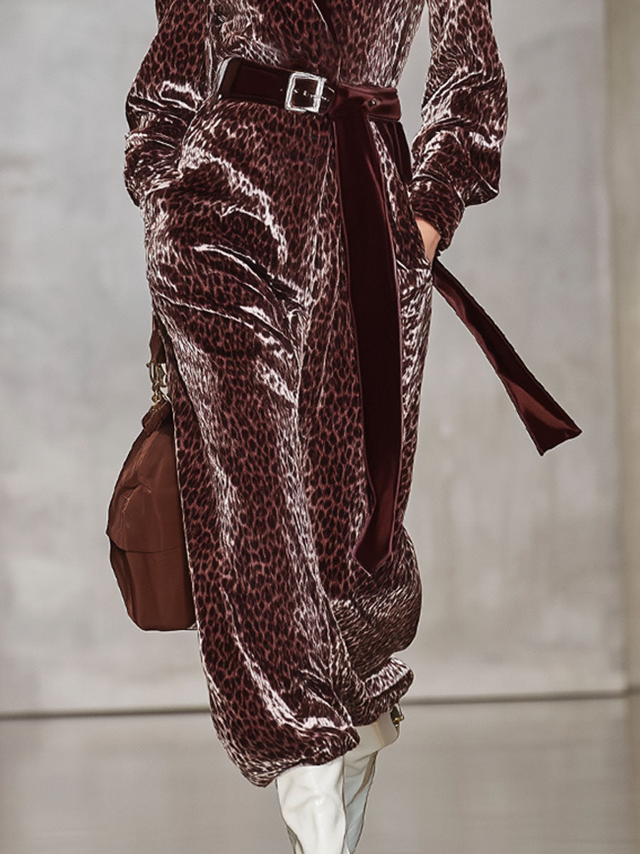 Combinaison en velours à motif léopard avec col cravate et silhouette décontractée