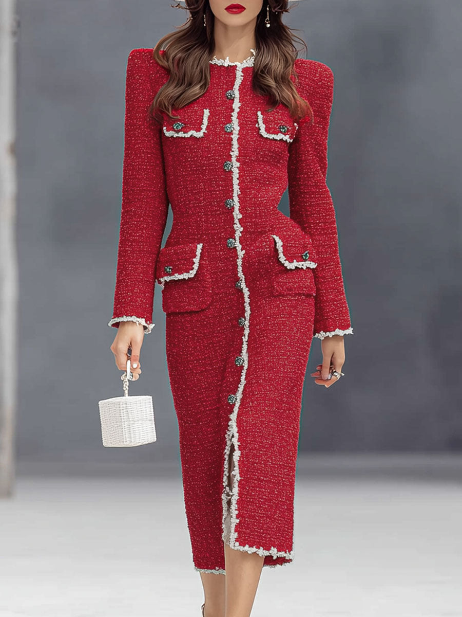 Robe Midi Élégante en Tissu Texturé avec Col Rond et Boutons Chic