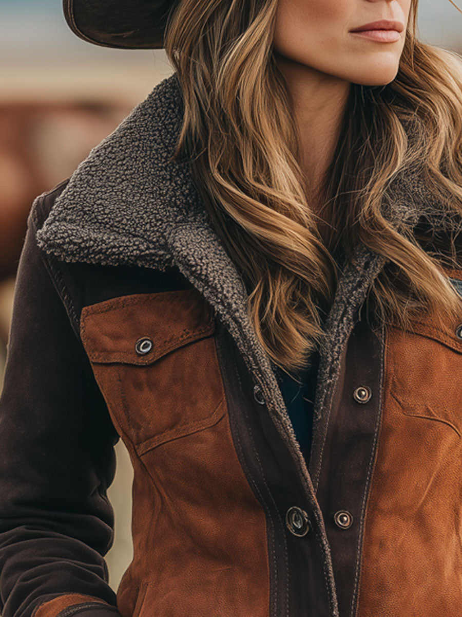 Veste en Polaire Fausse Suède Chocolat Caramel - Style Vintage Western