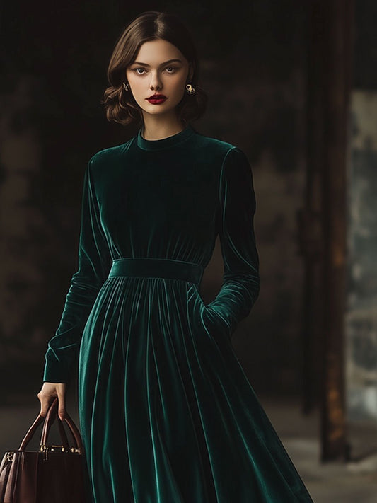 【Livraison Rapide en 24h】Robe Maxi Longue en Velours Épuré avec Col Montant et Poches Pratiques