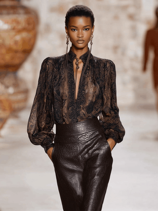 Chemise V en Chocolat Mocha - Imprimé Longue Manche Premium