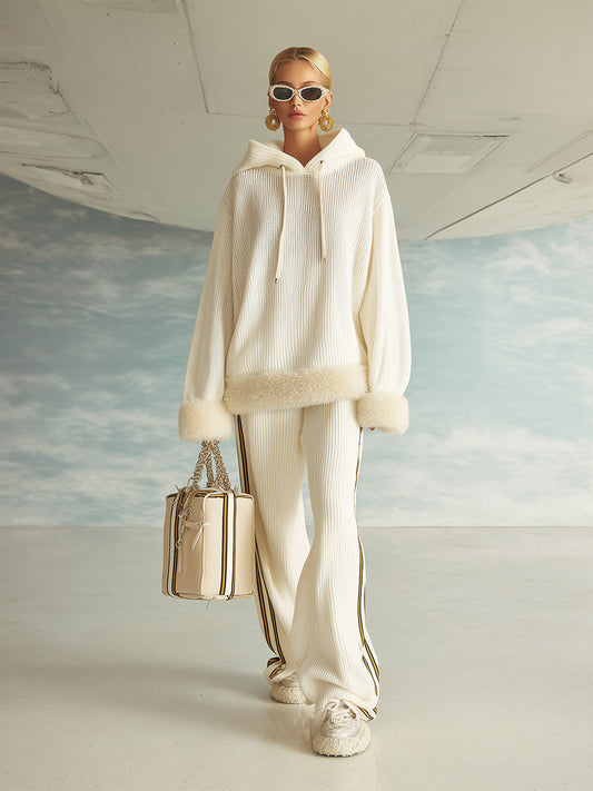 Ensemble Tricot Crème Blanc : Sweat à Capuche et Pantalons à Jambes Larges