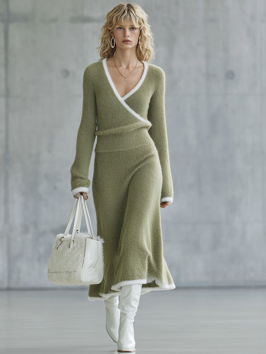Ensemble Rétro : Jupe et Pull Tricoté en Laine Vert Clair