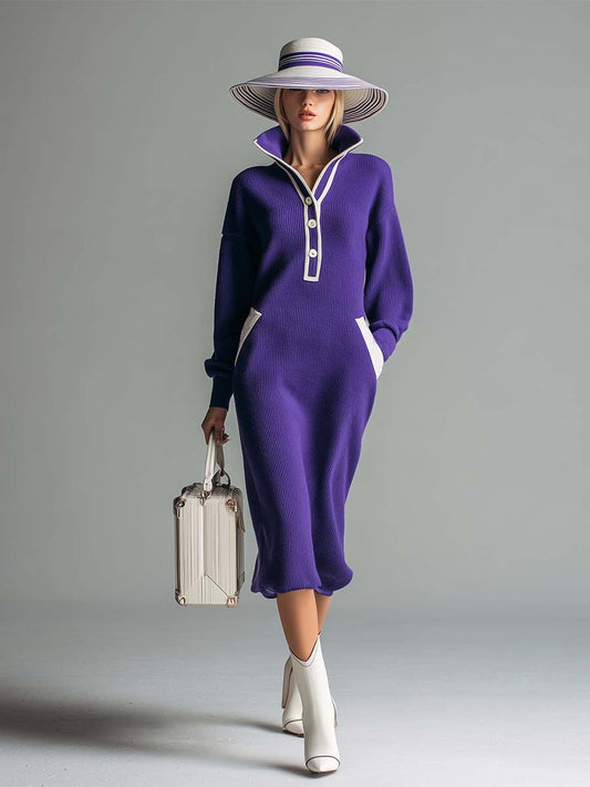 Élégante Robe Midi Tricotée Violet à Col Montant avec Détails Boutonnés