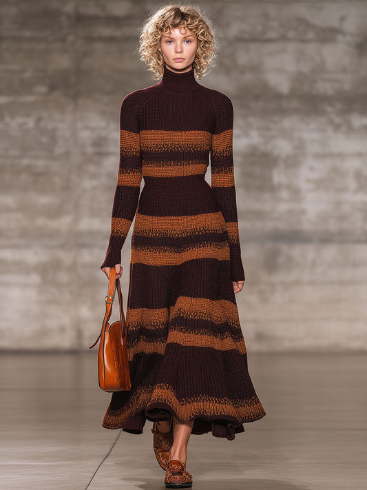 Robe Maxi Tricot Rayée Caramel et Chocolat avec Col Montant - Chic Rétro