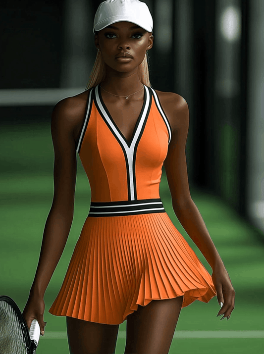 Robe Mini Plissée Orange Sans Manches avec Détails Noirs et Blancs - Expédition en 24 Heures