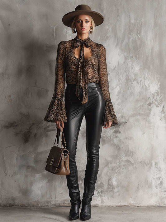 Chemise en Chiffon Léopard Marron à Manches Évasées - Style Rétro Chic