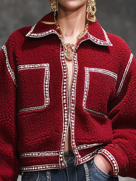 Veste en laine rose rétro à zip avec poches pratiques