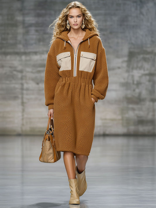 Robe Midi Décontractée en Polaire Camel Vintage avec Capuche et Taille Élastique