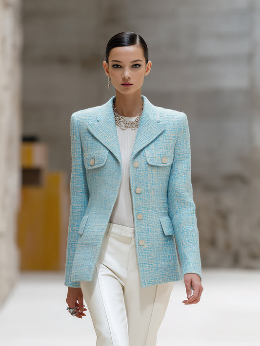 Veste en Tweed Bleu Élégante avec Poches à Boutons Argentés