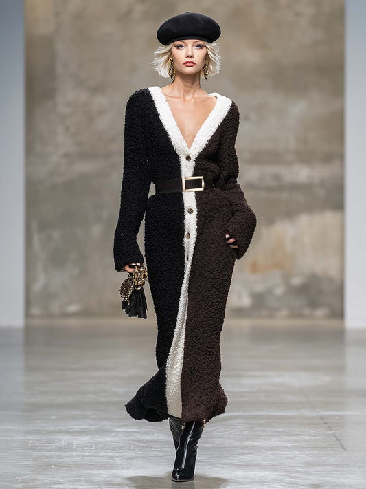 Robe Maxi Noire en Tricot avec Décolleté V et Boutons Frontaux – Détails Contrastants en Blanc