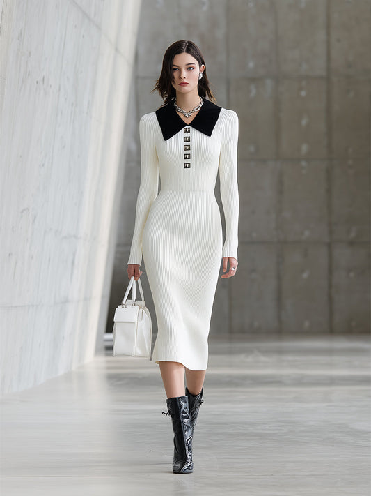 Robe Midi Tricotée en Patchwork Blanc avec Détails Noirs et Argentés