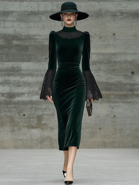 Robe Midi Vintage en Velours Vert avec Détails en Dentelle