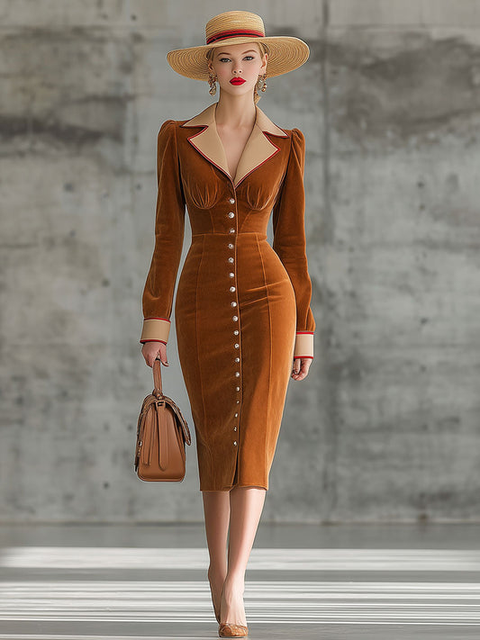 Robe Midi Vintage Élégante en Velours Caramel avec Détails en Similicuir