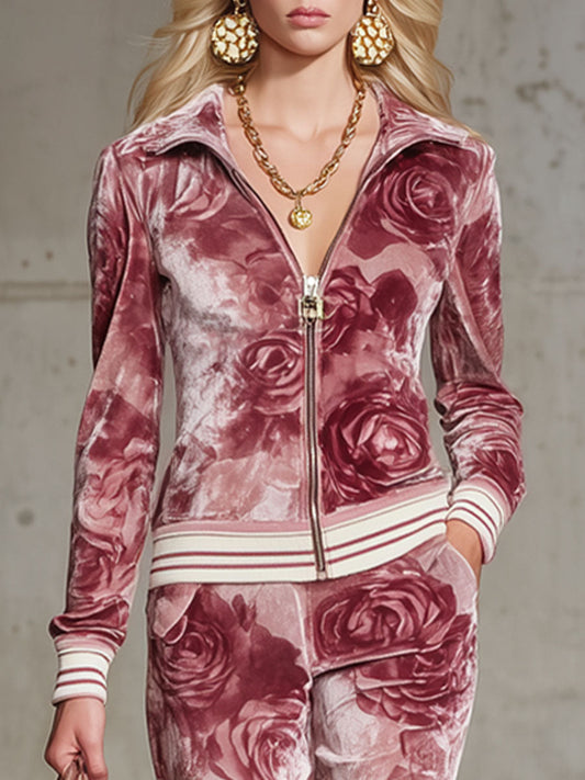 Ensemble Chic en Velours : Haut et Pantalon à Motif de Roses