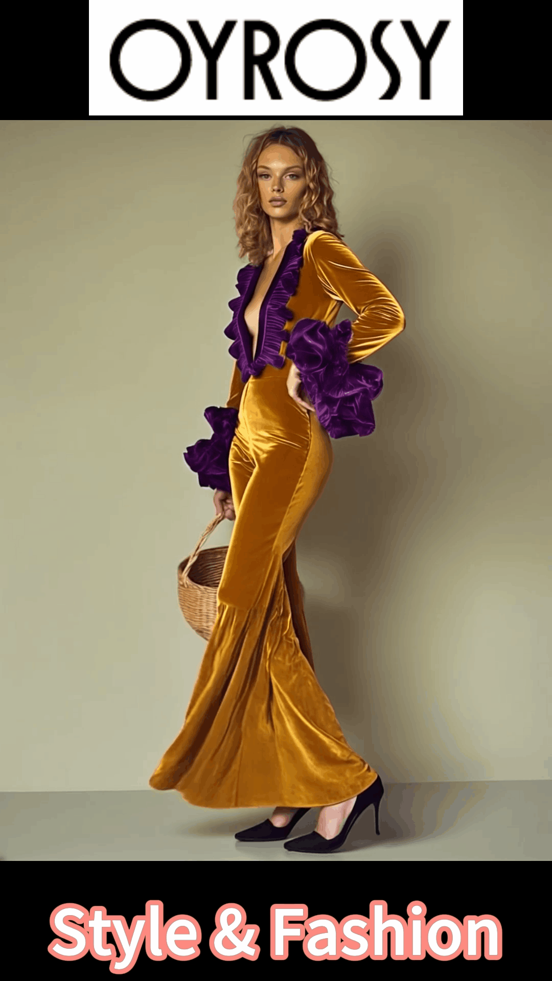 Combinaison Élégante en Velours Doré avec Volants Violets à Manches Longues - Parfaite pour vos Soirées Chic