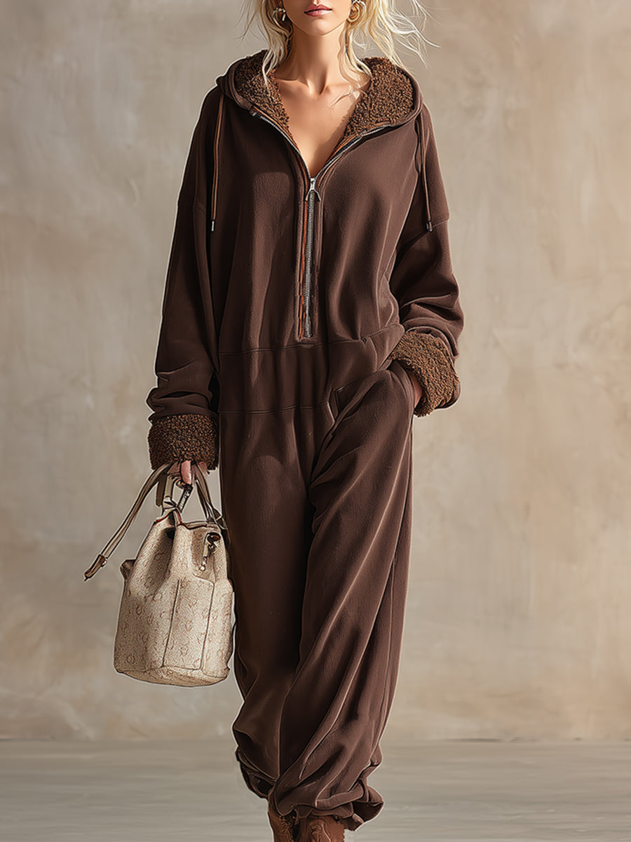 Combinaison en polaire marron à capuche : confort décontracté et chaleur douillette
