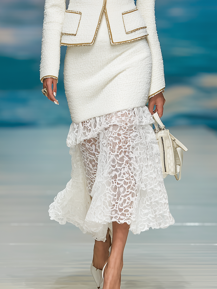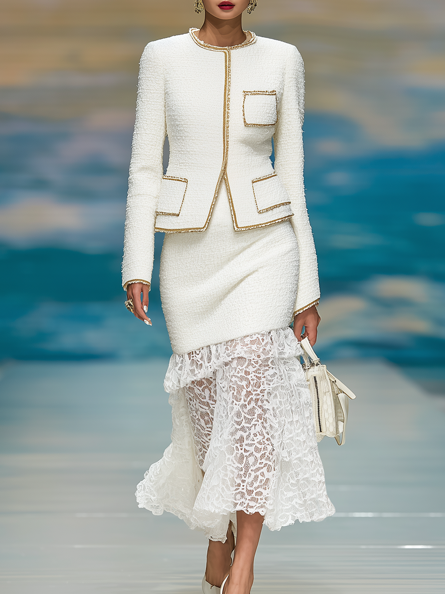 Ensemble Élégant en Tweed : Veste à Col Rond et Jupe à Bord Contrastant