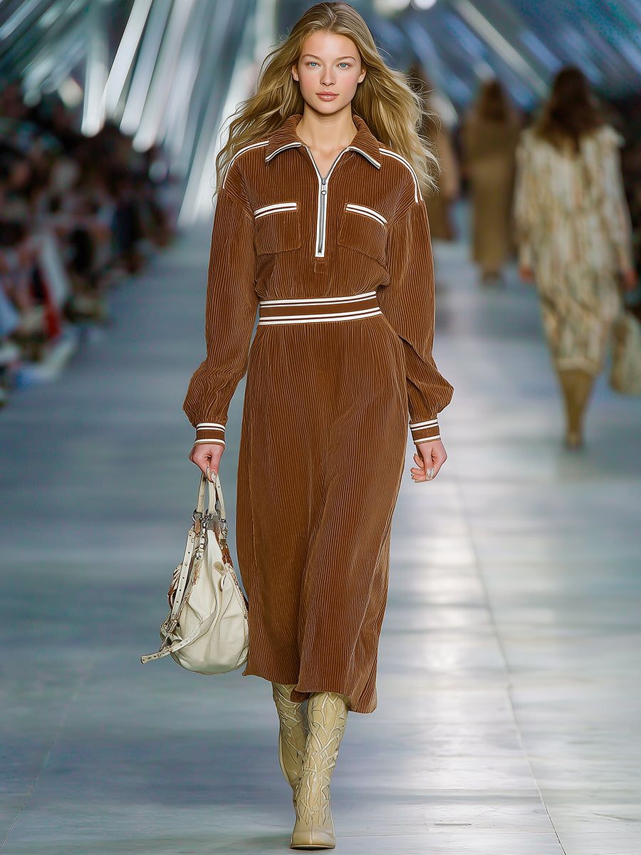 Robe Midi en Velours Côtelé Brun avec Détails Vintage Blanc et Col Rabattu à Zip