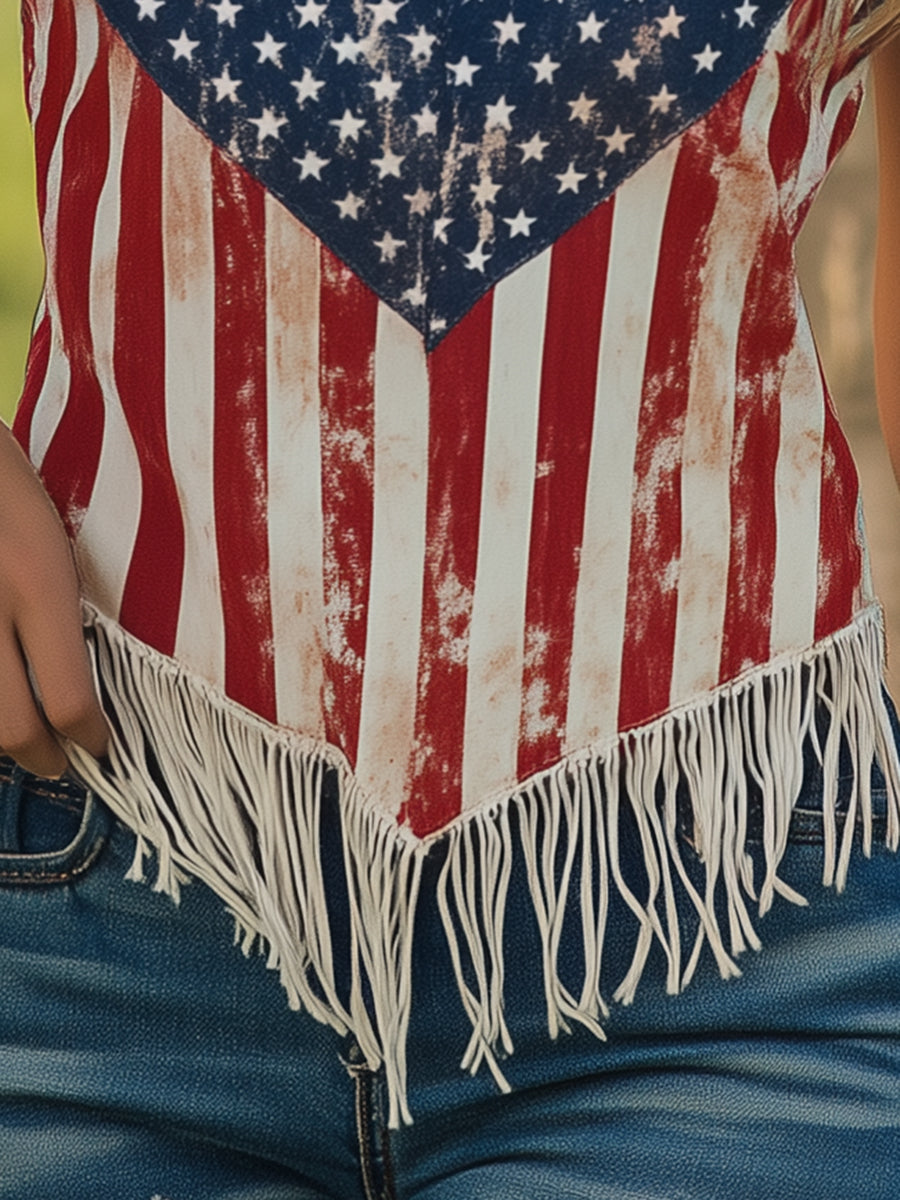 Top à Bretelles Spaghetti avec Imprimé Drapeau Vintage et Ourlet Frangé - Expédition Rapide en 24 Heures !