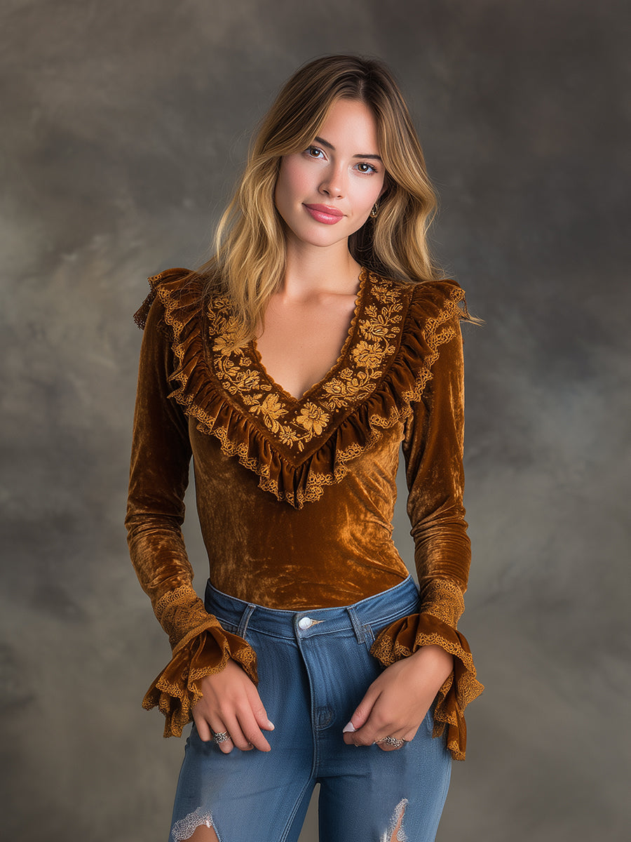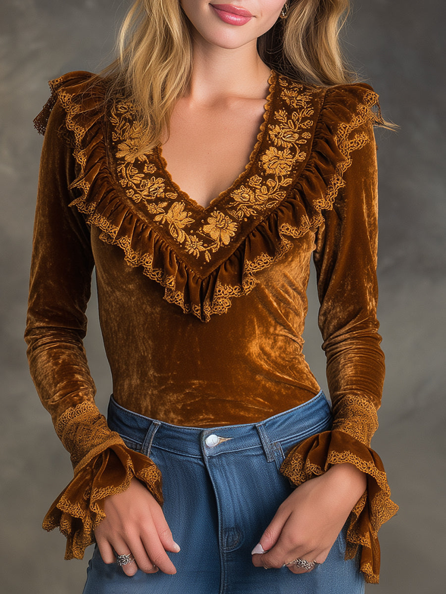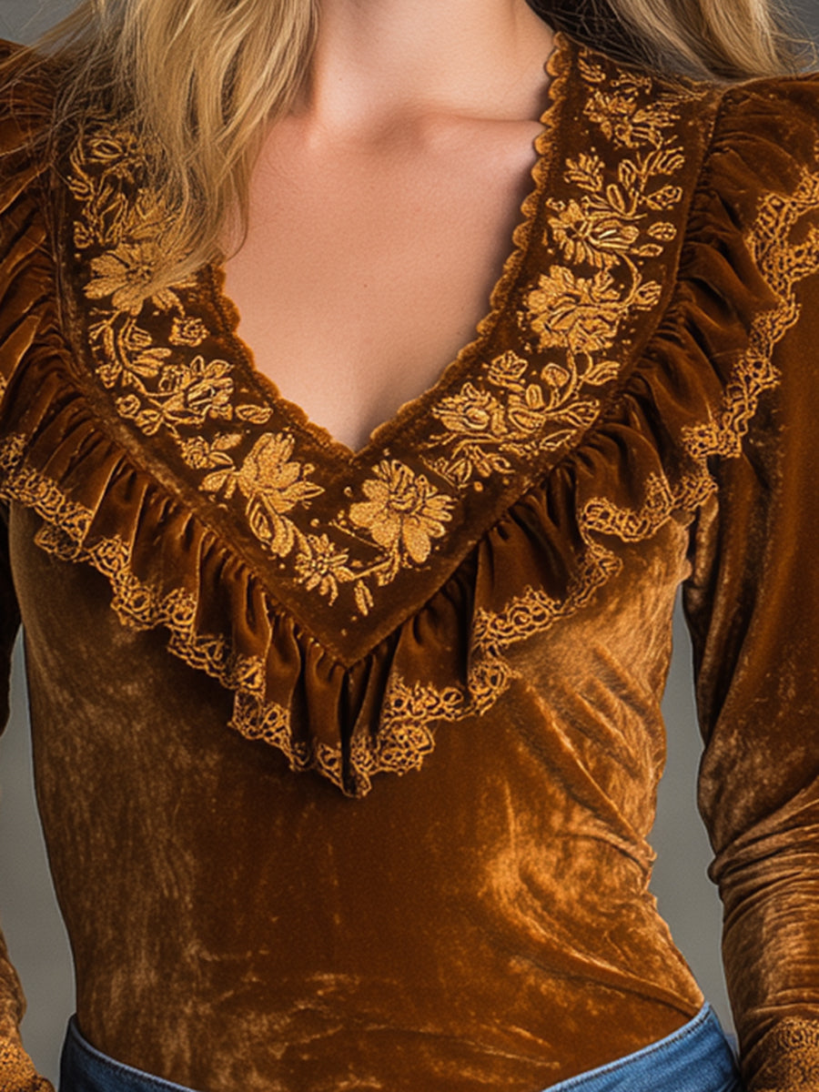 Haut en Velours Brun à Col V avec Dentelle Brodée et Manches Trompette